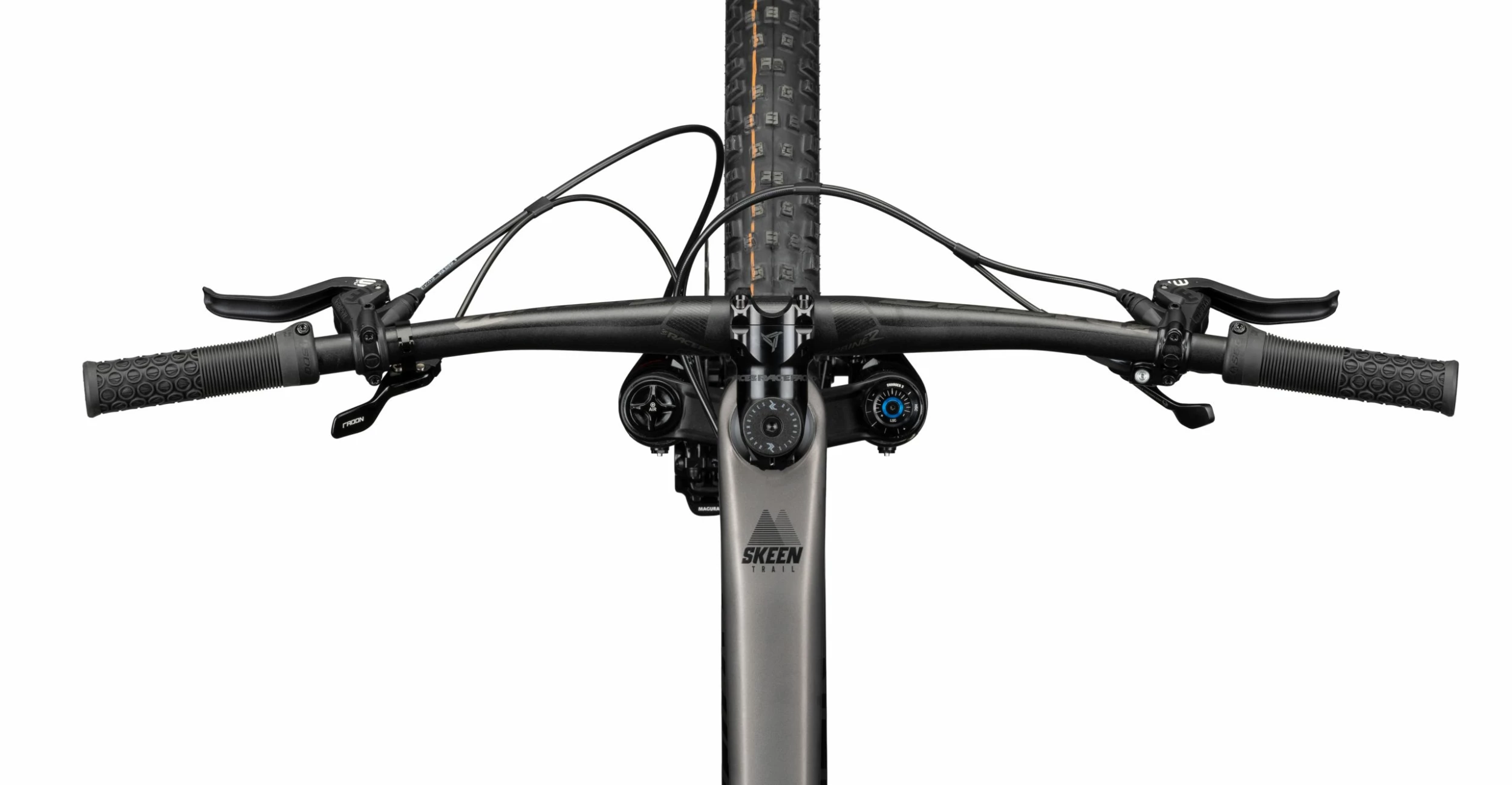 At the front, the new Pike Ultimate is the top fork in its range, offers 130mm of sensitive travel, has various adjustment options for rebound and compression and impresses with the brand new Charger 3 RC2 cartridge, especially on the trail. The Deluxe Select+ rear shock with its 120mm travel is in no way inferior to the fork. Together they form a well-balanced chassis that always gives you feedback on the ground, but also provides you with a lot of comfort. The powerful Magura MT Trail Custom, which with its four pistons at the front and the large discs has a massive bite, but also leaves you room to modulate sensitively. Full control over the terrain is provided by the sublime Race Face Turbine R cockpit, which flatters your hands with a perfect shape and always lets you keep calm. For demanding sections, simply lower the RADON Competition dropper vario post from the handlebar, shift your centre of gravity further back and let the bike do its thing. But our SKEEN TRAIL is also made for the uphill: extended tours and steep climbs are no problem, because we mount a complete SRAM GX Eagle 12-speed groupset, which not only changes gears precisely, but with its large cassette and the cleverly selected chainring also takes the fear out of every climb. The really light Newmen Evolution SL A.30 wheelset, which not only takes the strain off the scales and looks good, but also scores with its large inner rim width and stiffness. To round off the trail bike package, we opt for Schwalbe Nobby Nic tires, which have a fine mix of rolling performance, puncture protection and grip for the big tour. SKEEN TRAIL 10.0 – your new trail buddy!