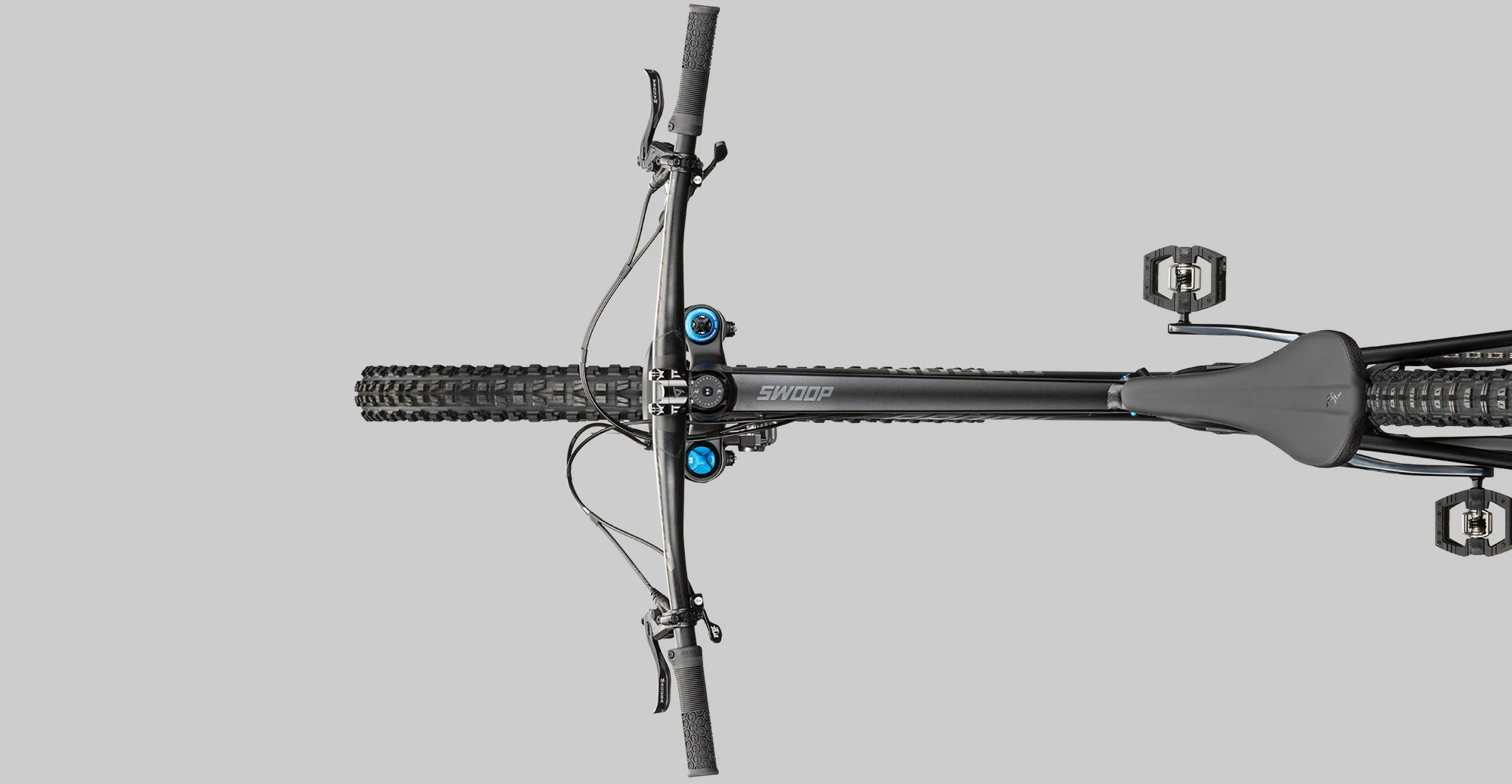 It starts with the Fox suspension with the Fox 38 Float Factory fork with fine-adjustable FIT GRIP2 shock cartridge and the Fox Float X2 Factory shock with 2-position adjustment. Both are coated with the classy Kashima coating, which reduces the response to a minimum. The incredible lightweight Newmen wheelset with Maxxis Minion DHR II and DHF tires, both with the grippy Maxxterra/Exo+ rubber compound, deliver an impressive level of grip. The SWOOP AL 10.0 is decelerated by the Magura MT7 brakes and the matching, large Magura Storm HC brake discs. The SRAM GX Eagle drive leaves you with enough reserves for even the toughest climbs thanks to its wide spread of 10-52 teeth. The highlight equipment is rounded off with the RaceFace Turbine R cockpit and the Fox Transfer seat post, which also makes for a visual highlight with the chic and classy Kashima Coating.